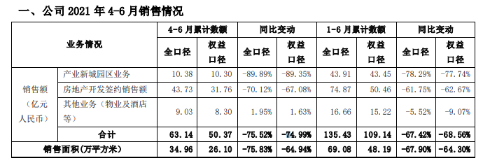 2021年上半年,华夏幸福累计录得全口径销售额为135.43亿元,同比下降67.42亿元;权益销售额为109.14亿元,同比下降68.56%。
