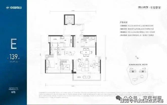139㎡的4房2厅2卫,1栋03/2栋02高区户型,电梯入户送独立公区,设计的是竖厅类双龙抱珠格局,四开间朝南,主卧大套间设计,有1个多功能间可以做书房,6.4米长观景大阳台,L型厨房带1个生活阳台,卫生间干湿分离,得房率:72.07%(不含赠送),西南朝向。