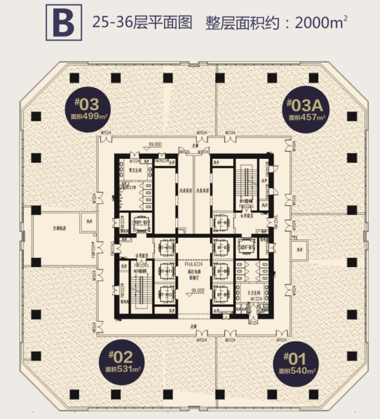 【楼栋数】共3栋。主要在售B座总高约162米,总计36层,首层为商业,层高5.4米,二层以上为5A甲级写字楼,层高为3.9米。