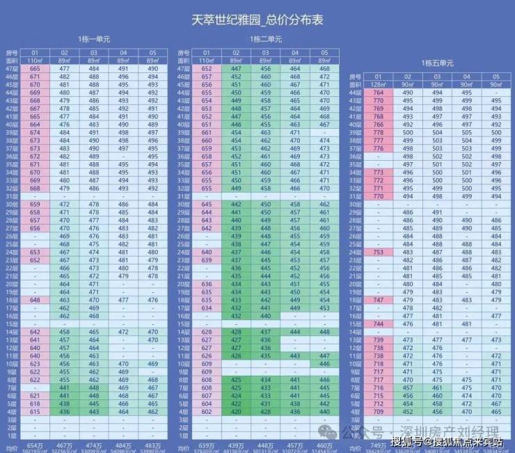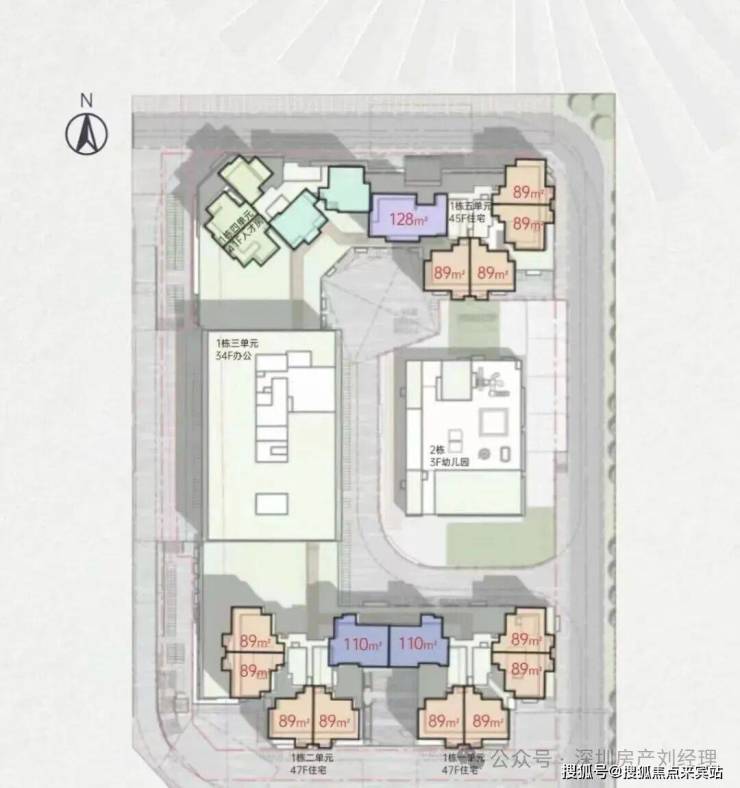 从平面图可以看出住宅均为每层5户的布局,1栋1、2单元为47层住宅,1栋5单元为45层住宅,1栋4单元为41层人才房,1栋3单元为34层写字楼,2栋为3层幼儿园。