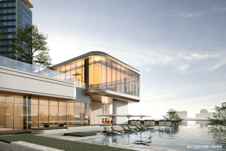·江幕⽆边际泳池:对标五星级酒店设计,泳池与江⾯⽆缝衔接,夜晚灯光下宛如流动星河。