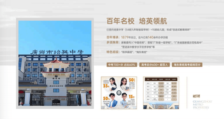 🏫54 班九年制培英中学(已签约):2024 年⾼考特控率增幅⼴州第⼀,初中部升学率连续 5 年超 90%,出家⻔即校⻔,教育资源为资产增值保底。
