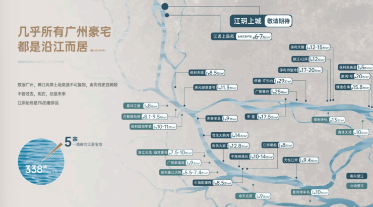 【占据 1% 稀缺资产】⼴州今年⼟地拍卖 338 宗地块,仅有 1% 是⼀线南向江景住宅,珠江两岸⼟地资源不可复制,南向线更显稀缺,江岸始终是 1% 的奢侈品。