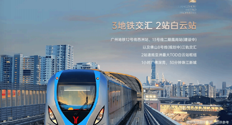 项⽬距离⽩云站约 3 公⾥Ì享受枢纽带来的⾼铁 + 城际 + 地铁多维交通(1 ⼩时直达深圳、佛⼭、东莞,融⼊湾区 1 ⼩时⽣活圈),快捷的交通也将带领板块产业腾⻜。