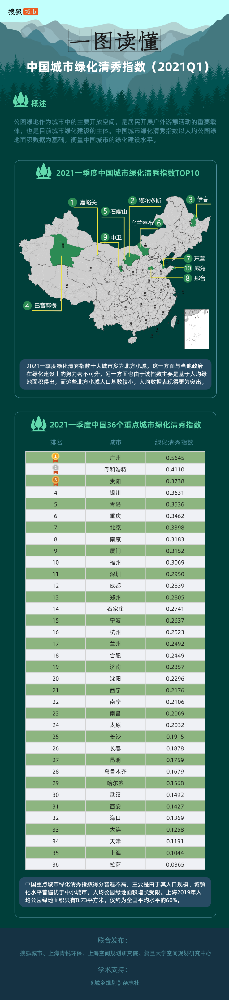 2021年一季度绿化清秀指数十大城市多为北方小城,这一方面与当地政府在绿化建设上的努力密不可分,另一方面也由于该指数主要是寄语人均绿地面积得出,而这些北方小城人口基数较小,人均数据表现得更为突出。