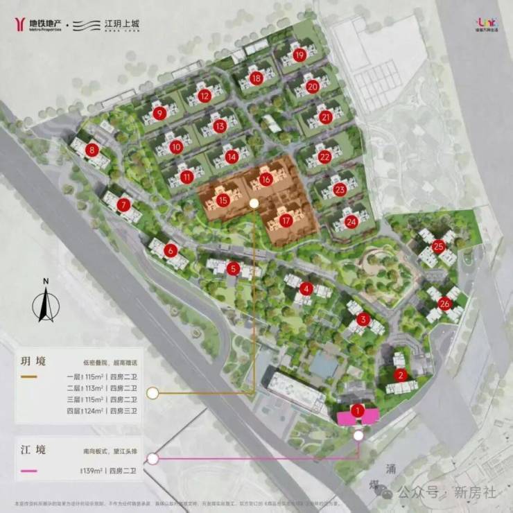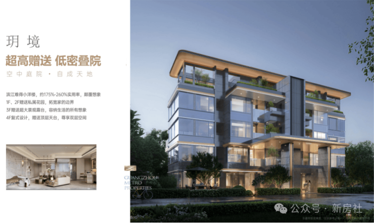 “玥境”为滨江小叠院,主打112-130㎡低密叠院,最大亮点是超高赠送率,1F、2F户型赠送私属花园,3F赠送超大景观露台,4F复式设计,赠送顶层天台。