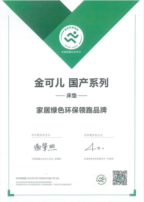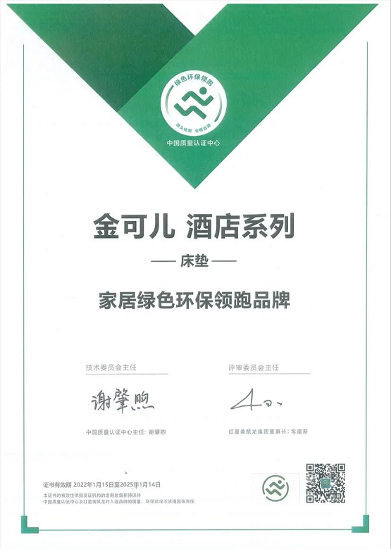 中国质量认证中心权威评测认证在2022年1月公开揭晓:金可儿旗下金可儿经典系列和金可儿酒店星选系列均拿下“家居绿色环保领跑品牌”认证。