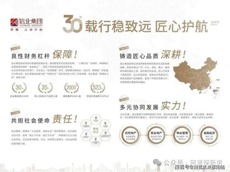 超30年实力品牌 匠心铸就生活范本信业集团,成立于1993年,前身为美心地产,立足于广州。辐射华南、华东区域城市。集团的发展战略以稳健为主,诚信经营,资金充足,企业推行多元化发展战略,以房地产为主,经营涵盖各大行业,逐渐成为大型化集团企业