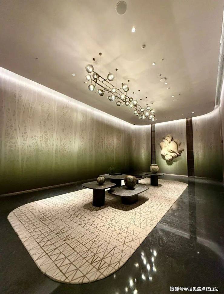 约 11 米层高、450㎡的主入户大堂,是归家的第一重仪式感。天然石材的温润纹理、实木饰面的细腻质感与金属线条的简约利落交织相融,搭配定制艺术吊灯—— 其设计灵感源自华侨城湿地的水草形态,以向上的艺术形态,将自然生机融入空间。