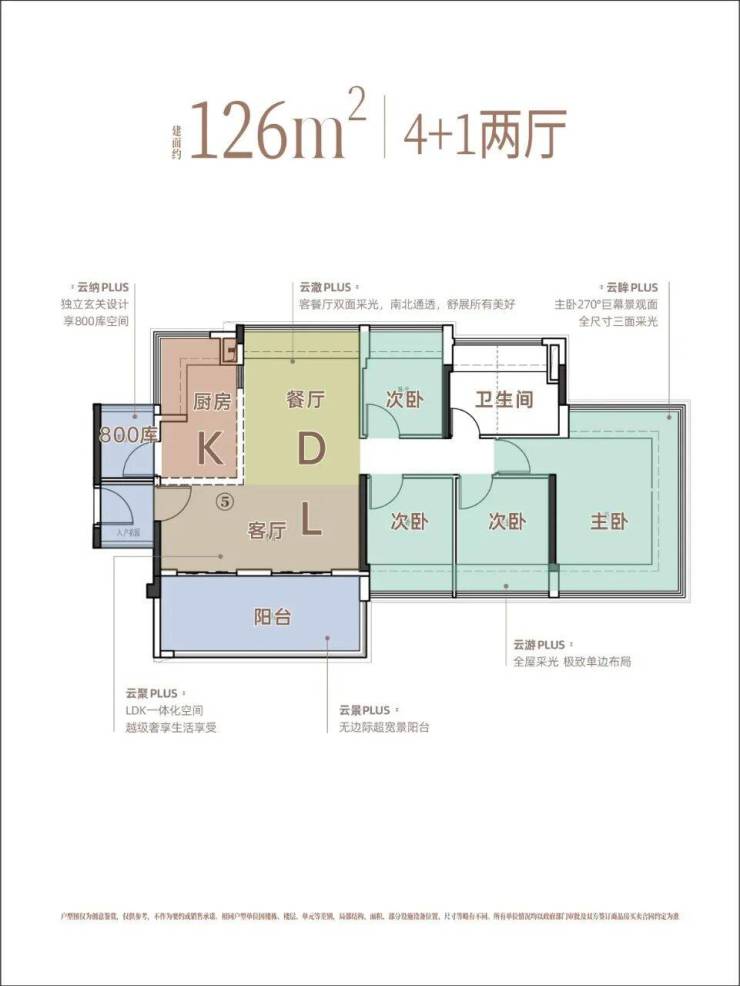 约126㎡4+1房,入户同样赠送800库收纳空间,拥有超豪华尺寸客厅,三间卧室朝南,+1空间改造性大,多口之家改善首选。