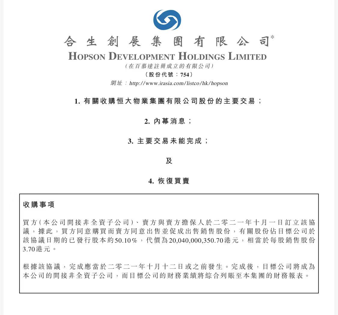 10月21日,合生创展等发布公告证实,由于卖方未能按照双方签订的合同条款履约,该笔交易尚未达成。合生创展明确要求中国恒大继续履行合同义务,实现恒大物业50.1%股权的转让;合生创展还将保留所有权利,对已经签署的股权转让协议必须按市场原则、依法依规完成交易,并对违约方追究其相关违约责任。