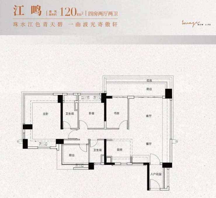 建面约120㎡:四房两厅两卫设计,共有2个户型可选,四开间朝南,居住与生活动静分离,南向大阳台或南北双阳台,主卧带270°飘窗