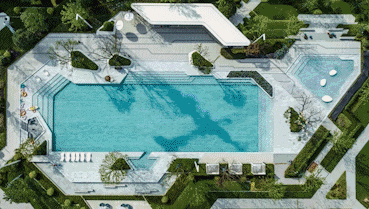 云起春晖的1700㎡全龄露天泳池,如镶嵌在社区中的一片海,日光倾泻,水波粼粼,孩童嬉戏的欢笑声与池畔的树影交织,让日常浸润度假般的松弛感。