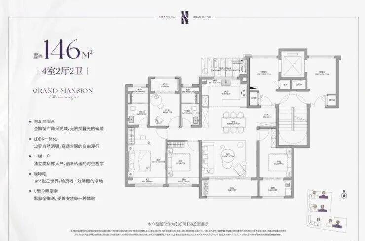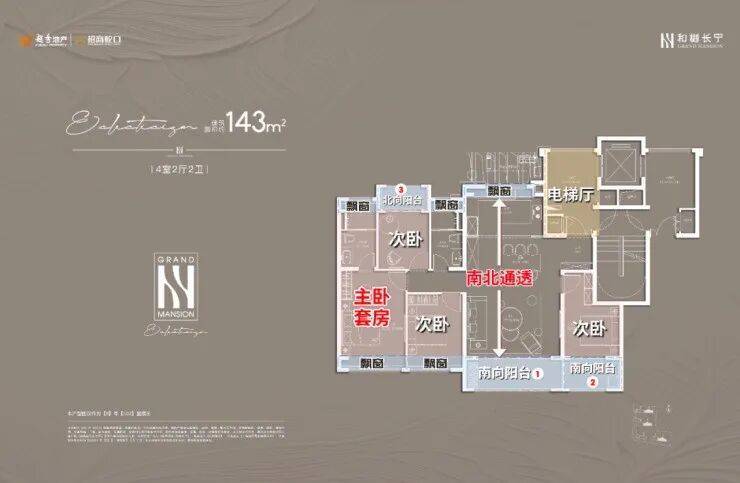 项目建面约143㎡户型的设计无疑是市场一流水准,一梯一户保证私密性和尊崇感;四开间朝南+大宽厅,采光效果爆棚;主卧贯穿南北套房设计,南北都有飘窗,舒适度可圈可点。