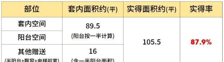 该户型大量的飘窗+双阳台设计,保证了每个功能间的通风采光,也提升了户型的实得率。经过专业建筑师测算,假设阳台全部封闭的情况下,项目建面约120㎡户型实得面积约105.5㎡,实得率约88%。(该实得率数据根据实得面积预估计算所得,仅供参考,不作为置业依据。最终得房率以购房合同为准)