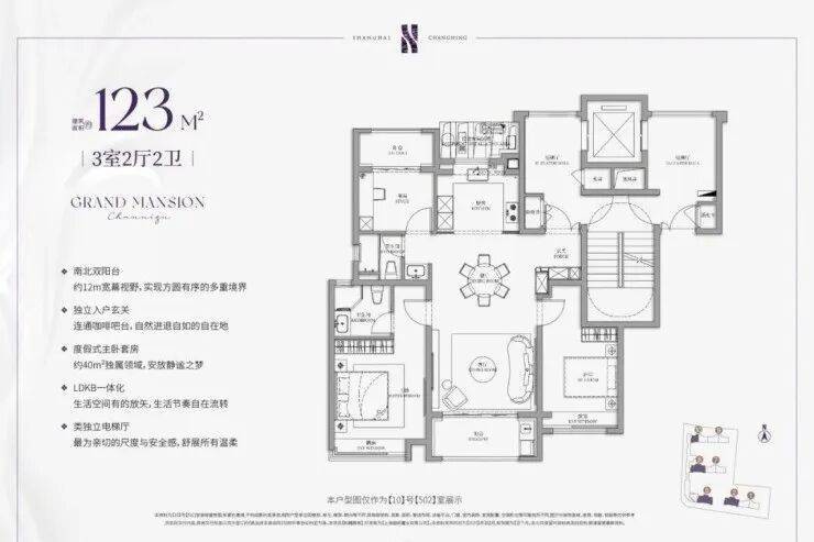 项目建面约120㎡户型是类独立电梯厅的设计,室内则是标准的南北通透+三开间朝南设计;主卧套房配置,自带卫生间,私密性和舒适度俱佳。