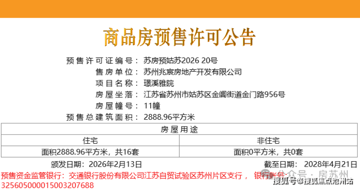 2026年2月13日,项目第三批房源领证,共16套,位于11幢,货值约1.52亿。