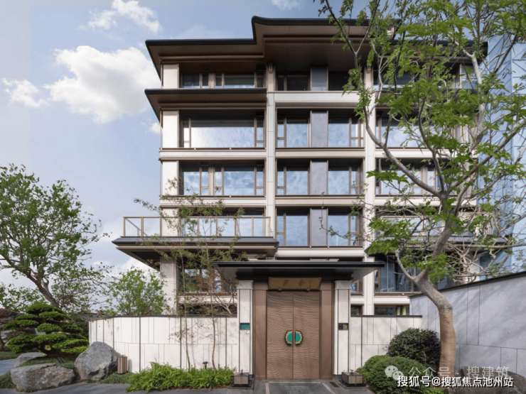 建发·璟园的立面设计,源自对宋式建筑体系的深度溯源。项目团队借鉴北宋壁画中的楼阁形象、兼取苏州现存建筑及园林中的楼阁元素,加以提取简化与演绎,形成“三阁并联”的立面语言。