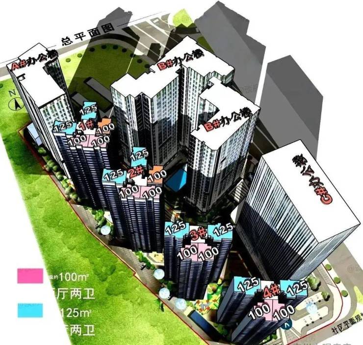 业态分布:1栋写字楼+2栋商办公寓+4栋住宅+建面约2000㎡商业