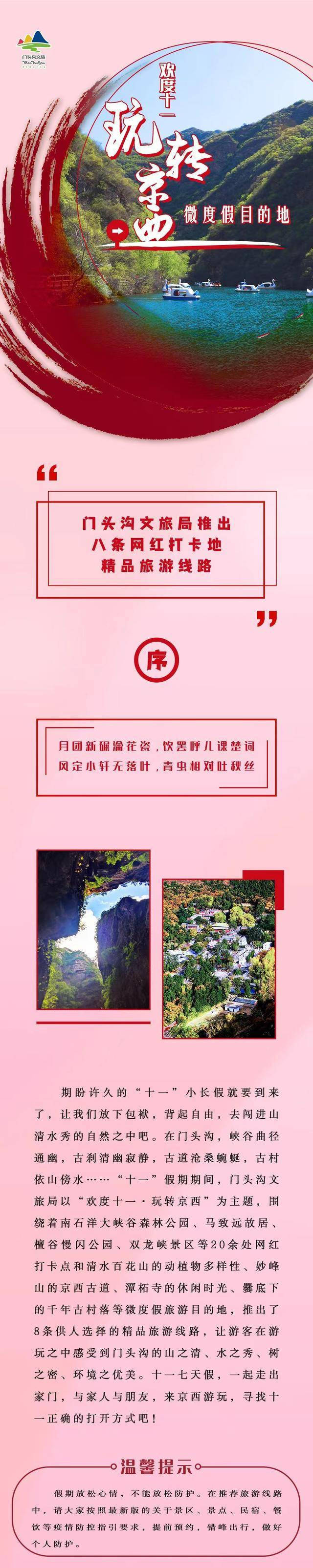 “十一”假期期间,门头沟区文化和旅游局以“欢度十一·玩转京西”为主题,围绕着南石洋大峡谷森林公园、马致远故居、檀谷慢闪公园、双龙峡景区、“上岸”文化IP等20余处网红打卡点和清水百花山的动植物多样性、妙峰山的京西古道、潭柘寺的休闲时光、爨底下的千年古村落微度假旅游目的地等内容,推出8条网红打卡地精品旅游线路。