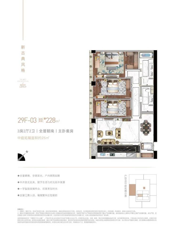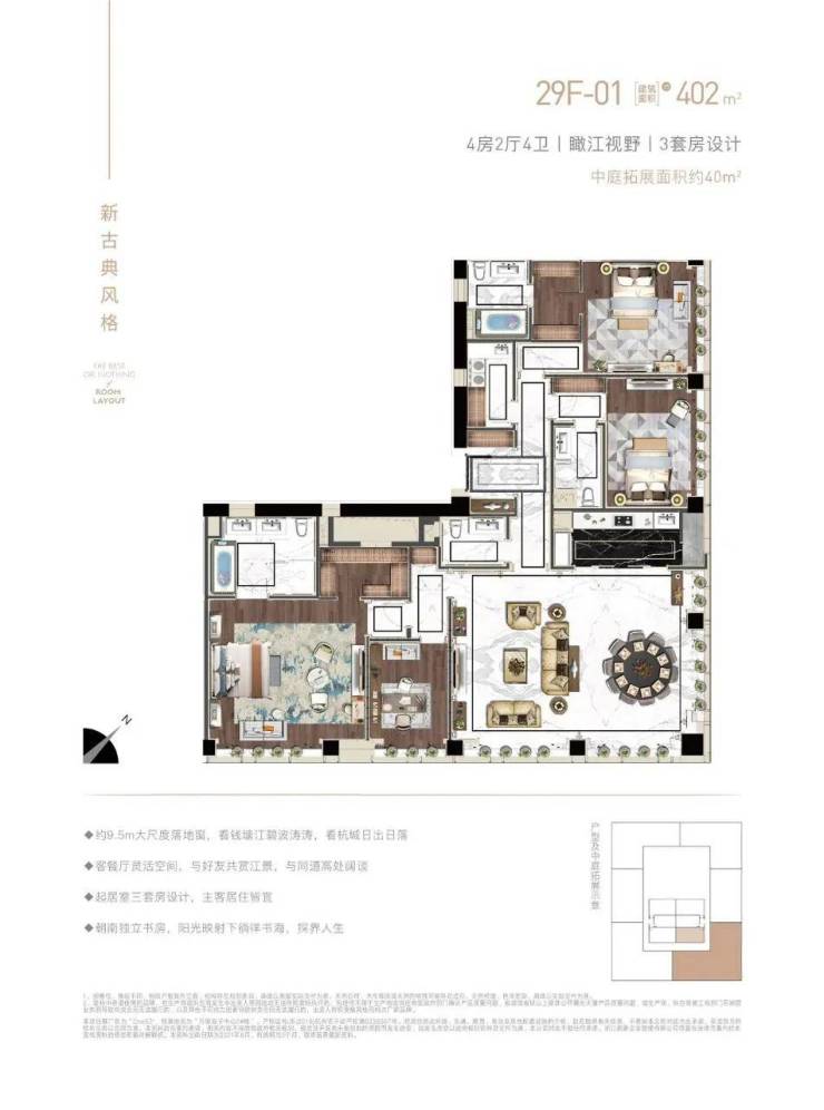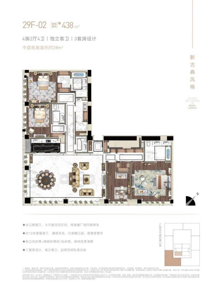 项目的高区部分 19-44 楼为我们的大平层公馆,面积有 228-438 方可供选择,大平层公馆有 3.4 米层高的现代风格和 4.8 米层高的新古典两种装修风格,特别是 4.8 米层高的新古典风格,在市面上也是绝无仅有的,真正体现了稀缺与奢华,并体现了您对住宅生活的高度。此外,本项目还特别赠送多功能厅,在这里可以打造您的私人空间。