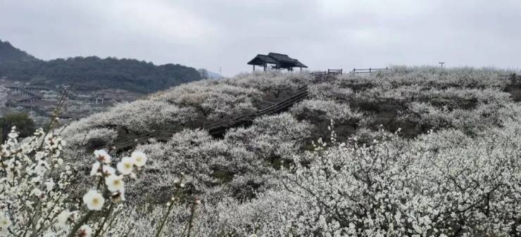 瀛洲梅园是原乡小镇的一大亮点,拥有近万棵青梅树,每逢新春佳节,梅花盛开,香气袭人,吸引了无数游客前来探梅、观梅、赏梅。