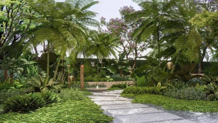随着步履深入,两侧层叠的花木与镜面水景相映成趣,全石材高墙围合出私密领域,曲径通幽的设计让每一步都沉浸于静谧悠然的归家意境。
