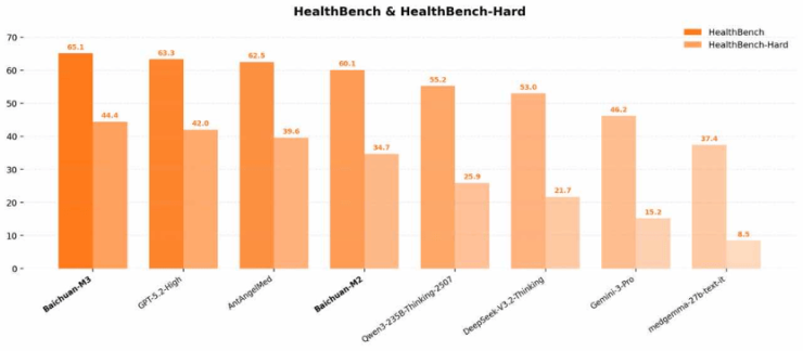 在权威评测HealthBench中,M3以65.1分的综合成绩位列全球第一;在测试复杂决策能力的HealthBench Hard上,以44.4分的成绩夺冠,对GPT-5.2实现超越。值得一提的是,M3的幻觉率降至3.5%,为目前全球最低水平。