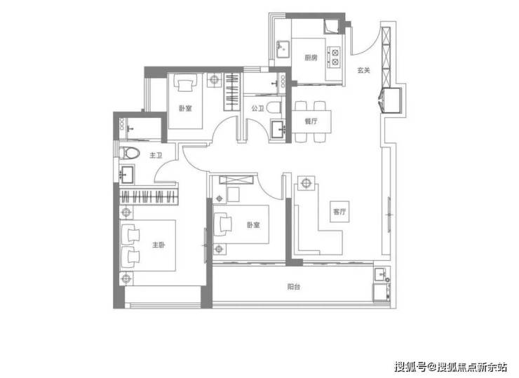 98㎡3房2卫:竖厅设计,客厅、餐厅、厨房呈直线排列,开间约3.7m,形成LDKB一体化空间,采光和通风效果好,动静分区。客厅连接次卧、约6.5m长的大阳台,晾晒或种植的空间。主卧15.62㎡,次卧8.68㎡-7.6㎡,得房率可达88%,东北-西南-东南朝向!