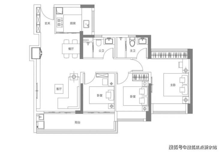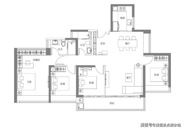 112㎡4房2卫:进门设有玄关,保障隐私与收纳需求。客厅开间达3.9m,LDKB一体化设计,动静分区合理。客厅连接次卧大阳台长6.5m。客厅,主卧、两个次卧四开间朝南,且主卧、次卧均带飘窗。主卧17㎡,次卧10.26㎡-9.06㎡-8.32㎡,得房率95%,东北-西南-东南朝向!