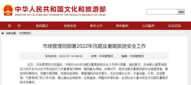 据文旅部网站消息,近日,文旅部市场管理司印发通知,对做好2022年汛期及暑期旅游安全工作进行部署。