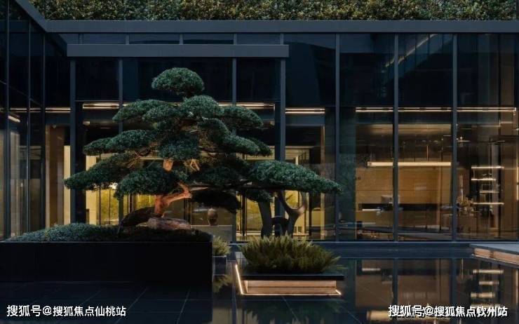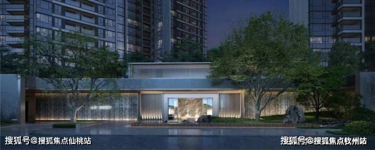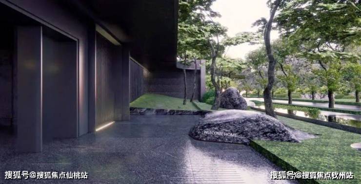 入口50米横向面宽,近6米的高跌水景墙与双层门楼让回家有了一份尊贵与隐奢;随着动线穿林,见山,伴水,来到模仿山石色调与铜色金属融合打造的酒店式大堂,一路草木清香、青石铺地、水系流动,自然的隐奢之美扑面而来。
