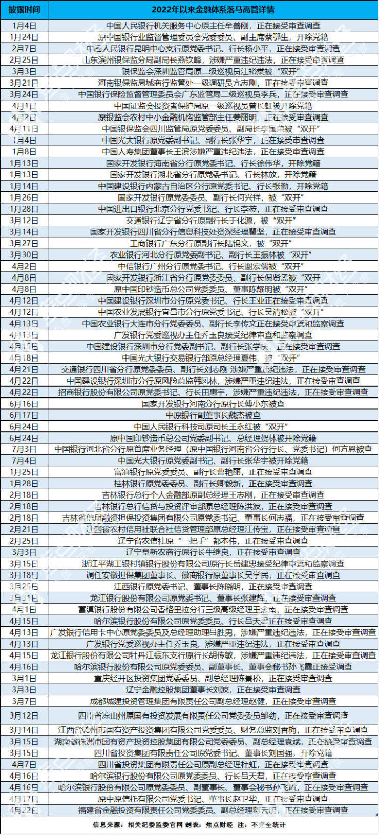 据焦点财经不完全统计,截至7月5日,2022年内金融体系落马的高管已达近70位,而去年一整年落马高管才70余人,银行系高管成为金融体系落马重灾区。其中,仅以4月份来看,至少有16名银行系高管落马,其中,5人已被“双开”。今年更是创下了“一日内两名央行系统官员因严重违纪被开除党籍”“10天内‘三大行’4人被查”的记录。此外,4月22日这一天3位银行高管落马,成为金融反腐加速的缩影。