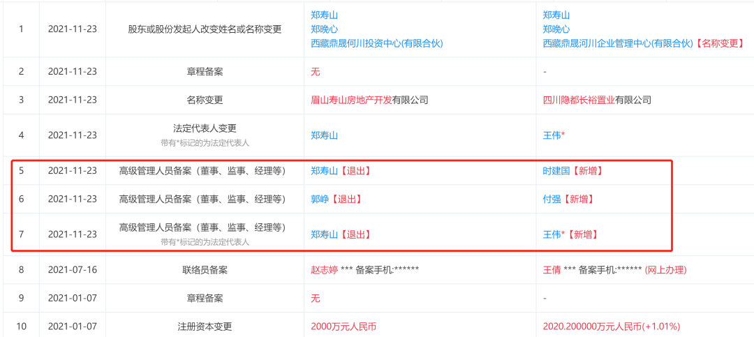 △四川隐都长裕置业有限公司工商信息经查询,更名后的项目开发公司——四川隐都长裕置业有限公司目前的股权结构在2021年11月之后尚未发生变更,但变更了三位高级管理人员。而这三位高级管理人员同时都在四川蓝华中浩实业有限公司任职高管,后者的大股东正是蓝城集团。由此,从企业工商信息的追溯来看,不排除已经更名的绿城·隐都项目是蓝城系轻资产运营接手的可能。