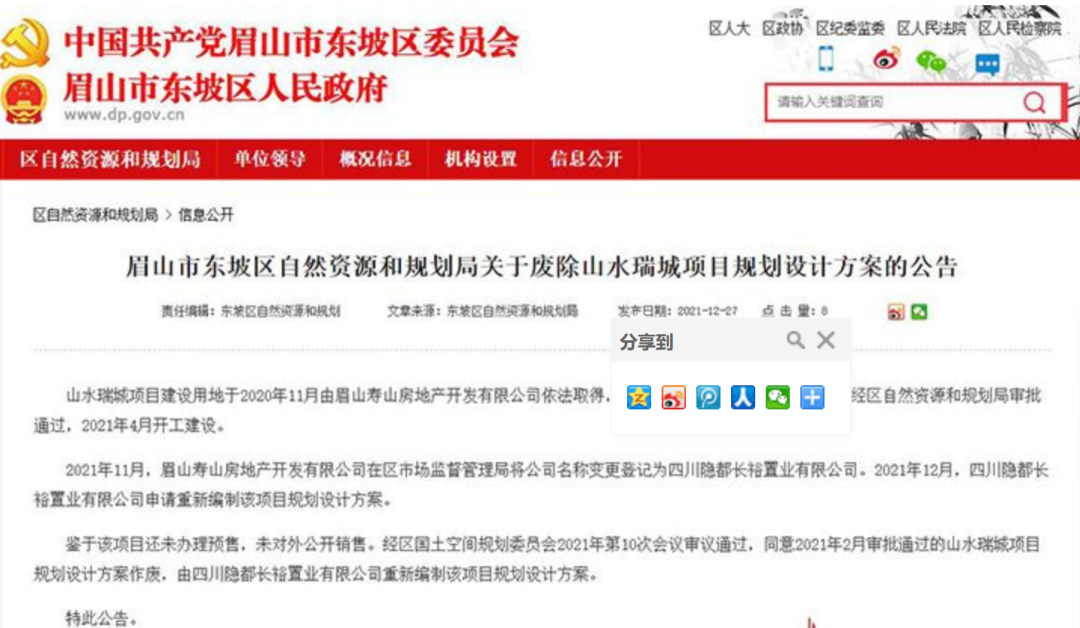 △图据眉山安家网该项目原名山水瑞城,由原眉山寿山房地产开发有限公司开发。据了解,项目在2020年11月即拿地,随后迅速打围进场开工,但未及开盘便一直搁置。随后坊间也曾频繁传出项目会被新东家接手的信息。2021年11月,眉山寿山房地产开发有限公司申请更名为四川隐都长裕置业有限公司,12月申请重新编制项目规划设计方案,并废除原来山水瑞城的相关规划方案。目前该项目也一直未取得预售和对外销售。