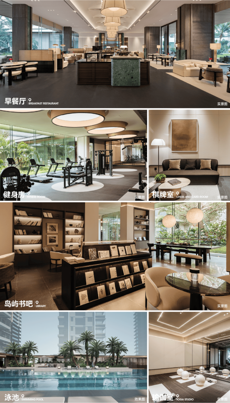 深度剖析高端酒店基因,创造功能与美感共融的6大社交空间,涵盖早餐厅、岛屿书吧、棋牌室、瑜伽房、健身房、近千平米双泳池等多元功能区,为旅居改善客群提供奢适服务。