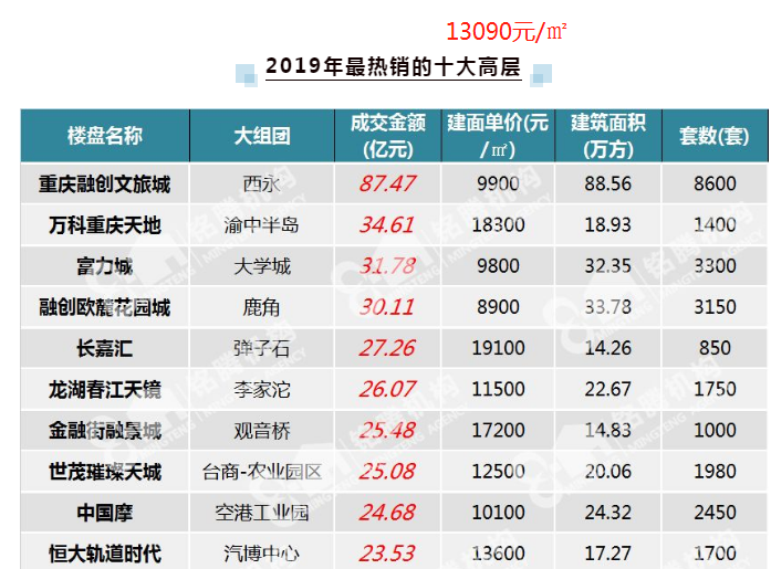 据可查数据显示,2020年重庆最火热的10大组团共计销售90603套,建面均价12413元/㎡。