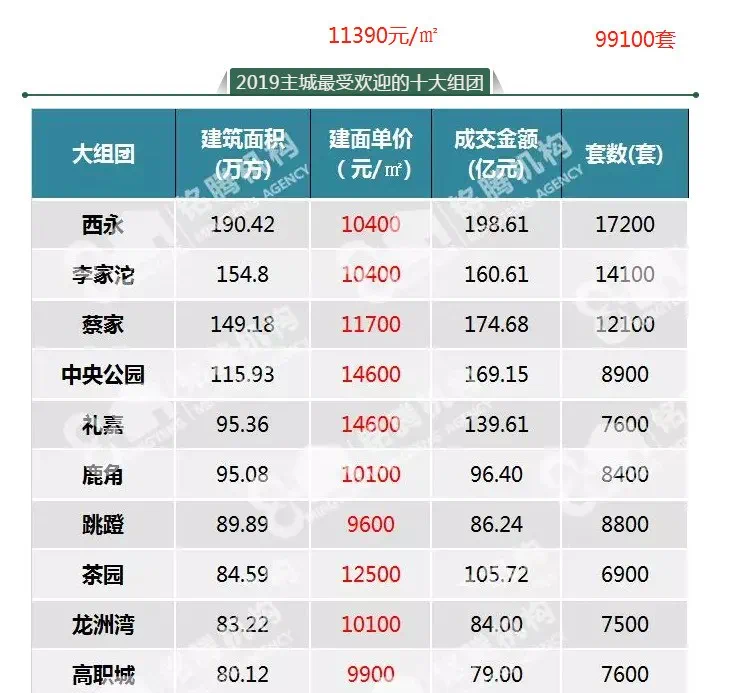 2019年重庆中心城区最火热的10大组团共计销售99100套,建面均价11390元/㎡