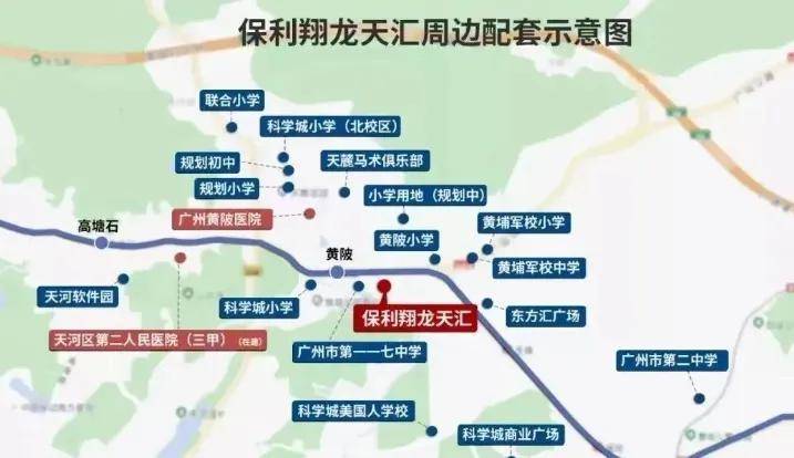 项目配建有幼儿园和托儿所,周边3km范围内有27个幼儿园、6所小学,如广州科学城实验小学、广州市黄埔区科学城小学东校区、科学城小学、黄埔军校小学、科学城小学(北校区)等。保利翔龙天汇只配建了一所24班的幼儿园、没有配建小学、初中,需要统筹周边入读,也就是摇号所以买这盘需要接受教育不确定性。虽然都需要电脑随机派位但从就近因素来看,紧邻黄埔军校中小学和科学城实验小学(原黄陂小学),小学大概率是在两所之间任选,都不会差。
