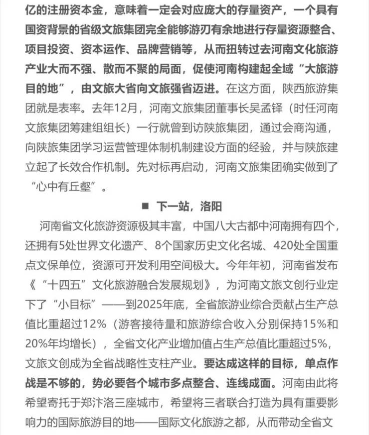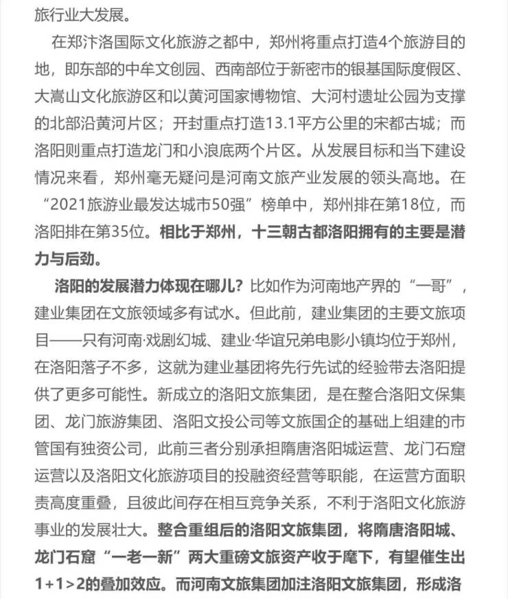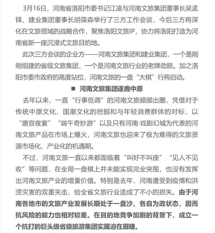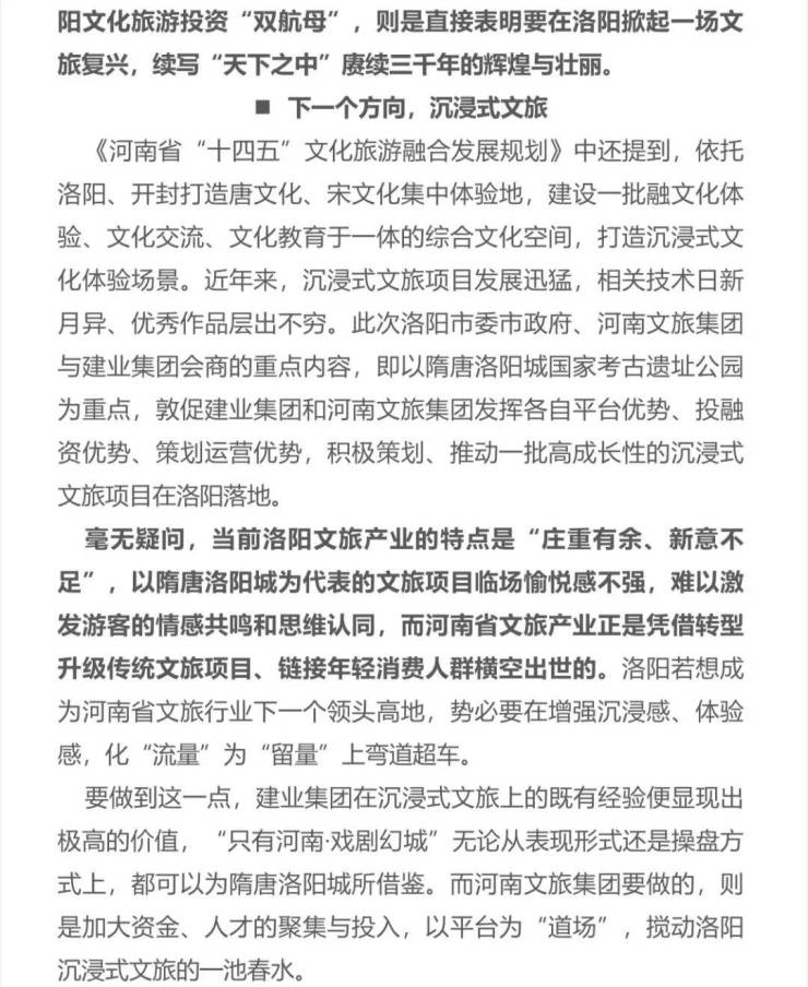 本周,洛阳市委市政府与河南文旅集团、建业集团举行了三方工作会谈,今后三方将深化在文旅领域的战略合作,聚焦洛阳文旅IP,协力将洛阳打造为河南省新一座沉浸式文旅目的地。河南文旅集团、建业集团一个是刚刚组建的省级文旅集团,一个是河南文旅行业的老牌劲旅,加之洛阳市委市政府的高度站位,河南文旅的一盘“大棋”行将启动。
