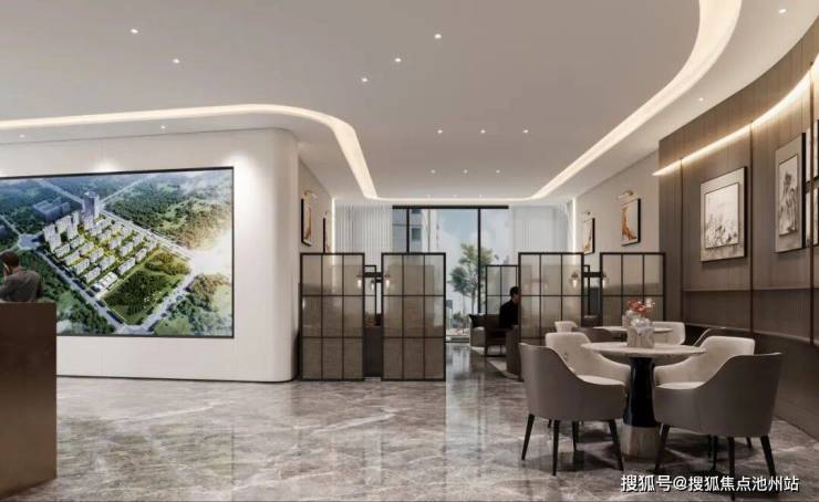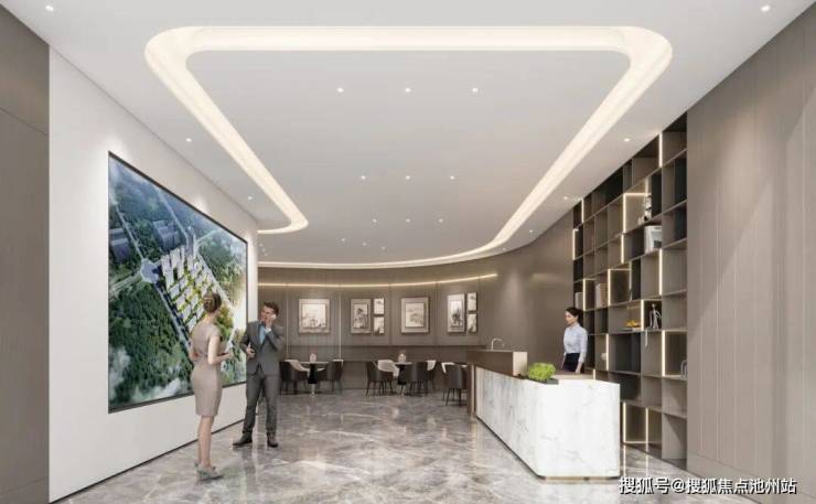 作为示范区入口的精神堡垒,前台以「山水云影」为灵感,进口卡拉卡塔白大理石台面蜿蜒成「山峦」造型,顶部灯带模拟云雾流动的轨迹,低调诠释奢华质感。