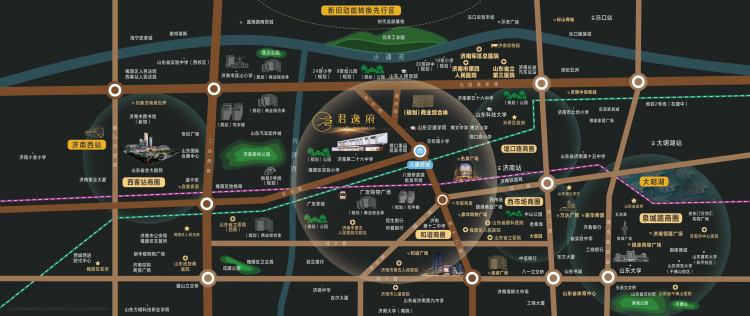 劝学里择址唐冶、高新东区双商圈交汇处,百联、首创双奥特莱斯——十万方级商业巨擘,集购物、休闲、娱乐和餐饮于一体;在建中的鲁能、鲁商等商业综合体进一步优化区域商业,自建6000m²集中商业,吃喝玩乐购就在家门口。