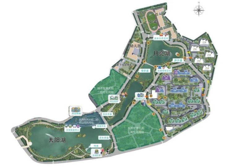 双湖环绕的月亮湖与太阳湖经三重生态净化,水质达二类标准,可泛舟游湖、垂钓观景。社区内保留原生古树,结合243万㎡山湖林海(相当于3.5个天河公园),打造四进花园、三轴十境,归家即享度假体验。