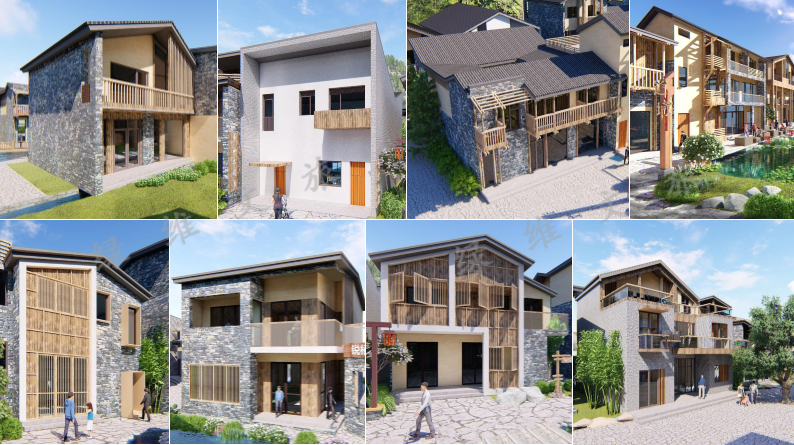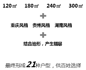 建筑设计过程中,我们充分提取重庆民居、贵州民居、湖南民居等元素进行提取,充分调查了房地居民对于居住面积的户型,我们结合面积、设计风格,结合地形和错层,设计21种户型供百姓选择。
