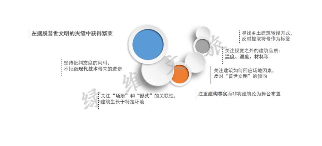 伴随着全球经济一体化,全球文化趋同之势日渐趋强。国际式的通用建筑风格开始蔓延全世界,各国建筑的地域风貌被淹没。中国各个城市开始出现千城一面的问题,这是在标准化和现代化过程中必然走的一条路。新乡土主义就是在这样的大潮中应运而生,我们在追求“不同”,追求当地本身、本土生长出来的特色的过程中,表现出来的内容。每年都在评选“十大丑的建筑”,丑的建筑、丑的景观、丑的构筑物,共同的特征都是具象的,很像某种东西。这些其实也是设计在成长过程中的必然之路。设计师在追求“不同”的过程中进行了各式各样的探索。而新乡土主义就在这样的大环境背景下的建筑思潮中应运而生。最早的新乡土主义来源于20世纪在欧洲出现的“批判地域主义”思潮,其代表人物,哥伦比亚大学建筑学教授,著名建筑师、建筑历史学家、建筑批判家肯尼思·弗兰普顿,提出了其核心特征: