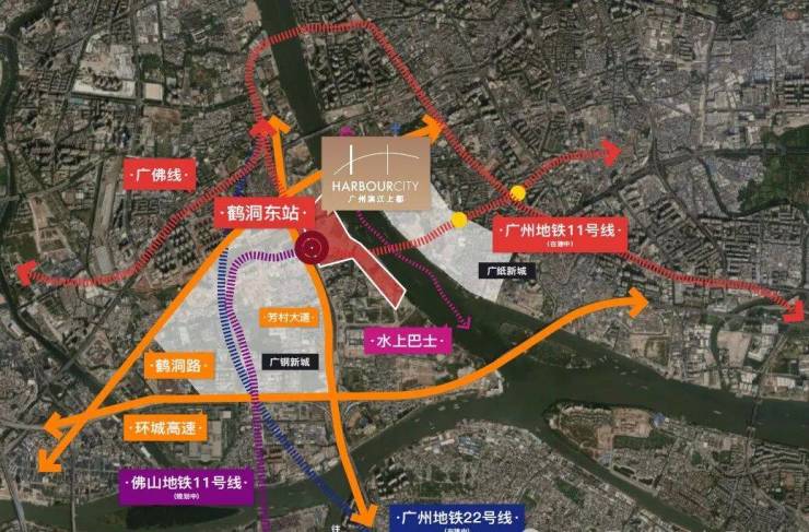 广州11号线鹤洞东站地铁上盖,拥有3横2纵大路网+公交站场+水上巴士,集水、陆、轨等多维交通方式于一体,半小时城央生活圈,1小时湾区生活圈。