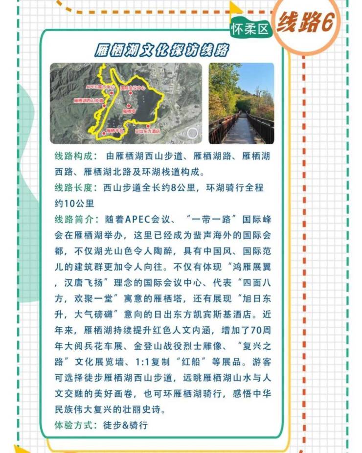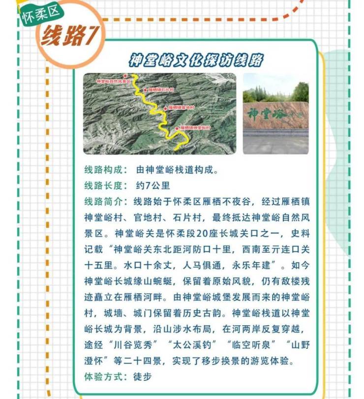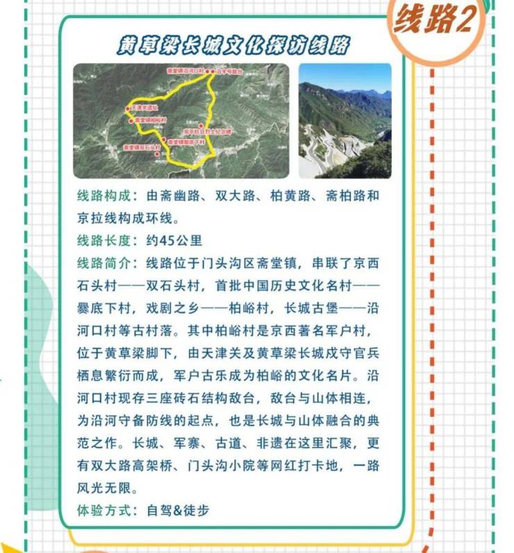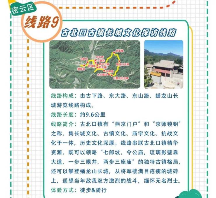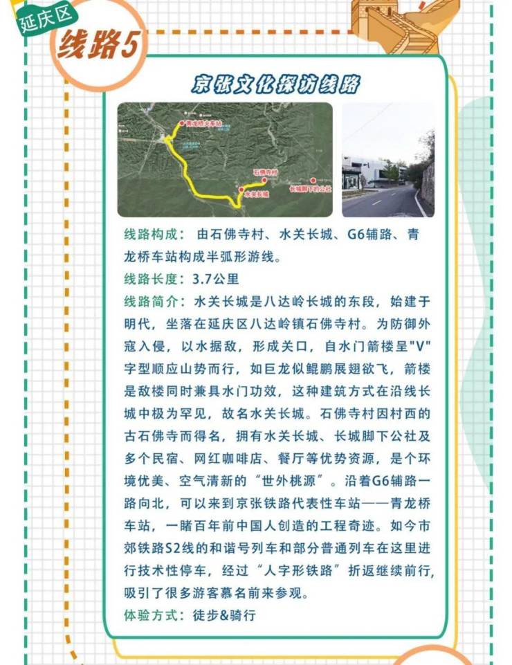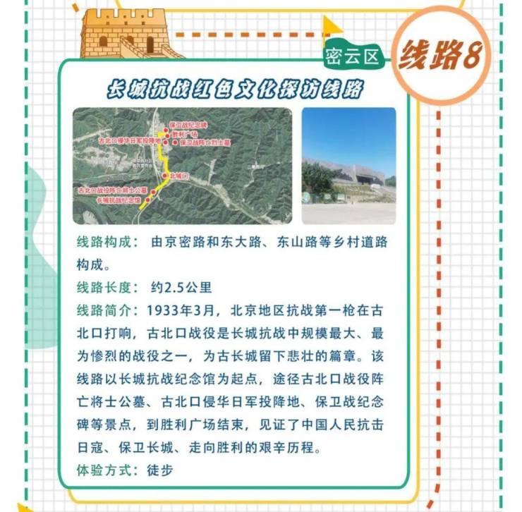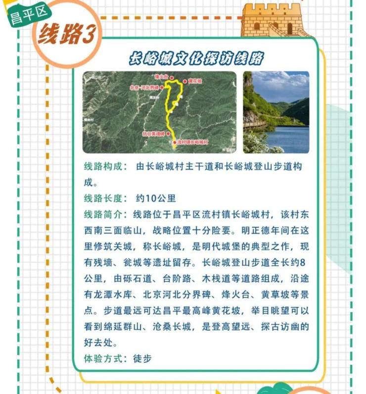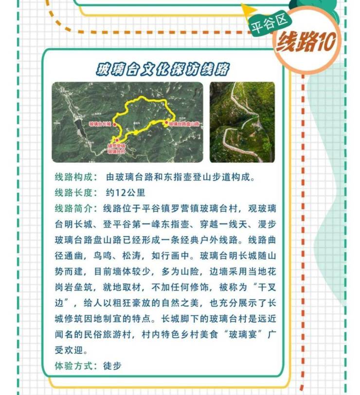 10条线路分布于长约400公里的“京畿长城”国家风景道主线周边,涉及门头沟、昌平、延庆、怀柔、密云、平谷六区,探访内容涵盖城墙敌楼、军堡军寨、抗战遗址等丰富多彩的长城文化资源,沿途更有乡村民宿、登山步道、非遗体验、网红打卡地等,展现了长城沿线丰厚的文旅资源。