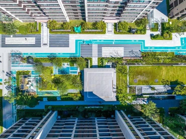 项目景观采用功能分区设计有儿童活动场地,大人社交客厅,还有约350米环氧跑道,打造六大生活空间场景,形成社区可赏可游的景观动线。