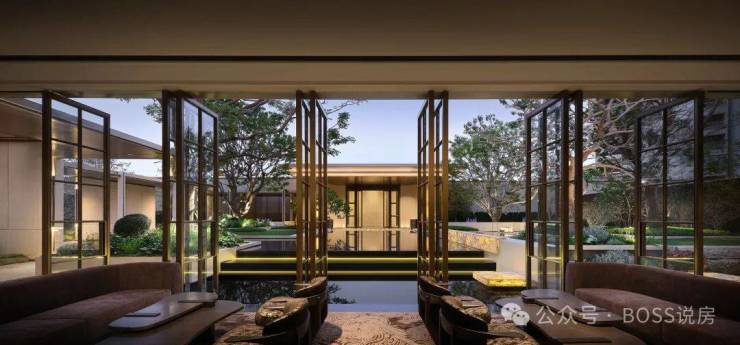 项目共规划约7.2万㎡超级中央园林,目前已开放实景园林。入户大堂以宝格丽酒店设计风格为灵感,搭配约7米高的艺术移门和奢石弧形墙面,高级感满满。