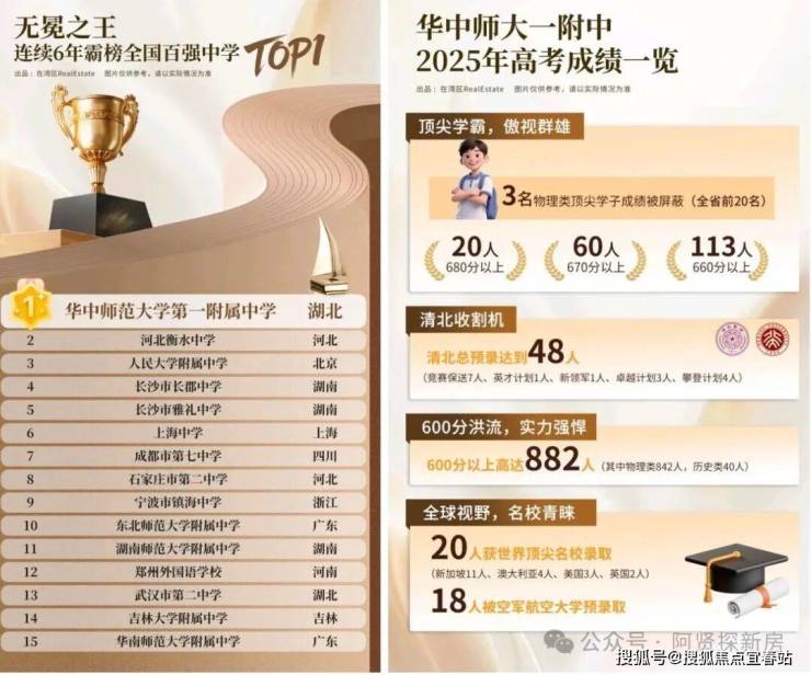 🥇同源全国性知名学府华中师大一附中,2023年高考一本上线率近100%,2024年600分率攀升至96%,清北录取人数超60人,清北录取率7%以上,被誉为“清北摇篮”,为区域带来优质教育。